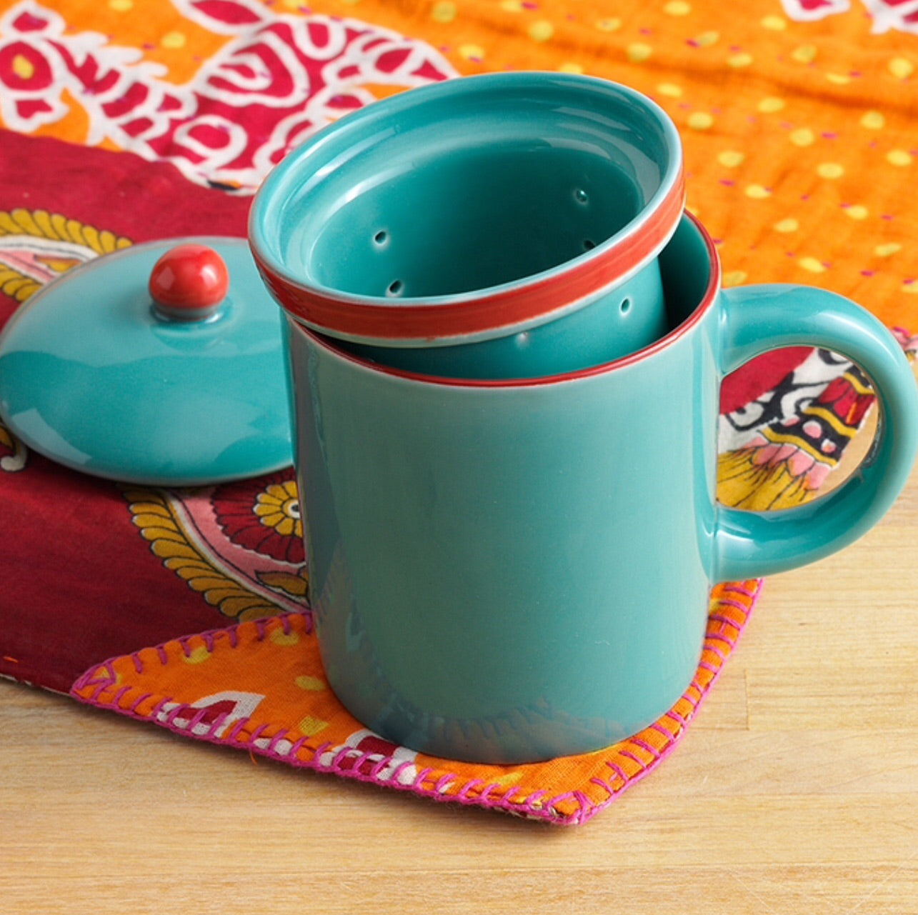 Richly colored tea infuser mug is crafted by hand in the Bat Trang village of Vietnam, famous for its centuries-old tradition of creating fine ceramics. The Song Cai collection has a clean, modern design complemented by a fresh turquoise glaze and contrasting red rims. Oven, microwave, and dishwasher safe. Holds 12 oz. 5 1/2"h x 3 1/2"dia