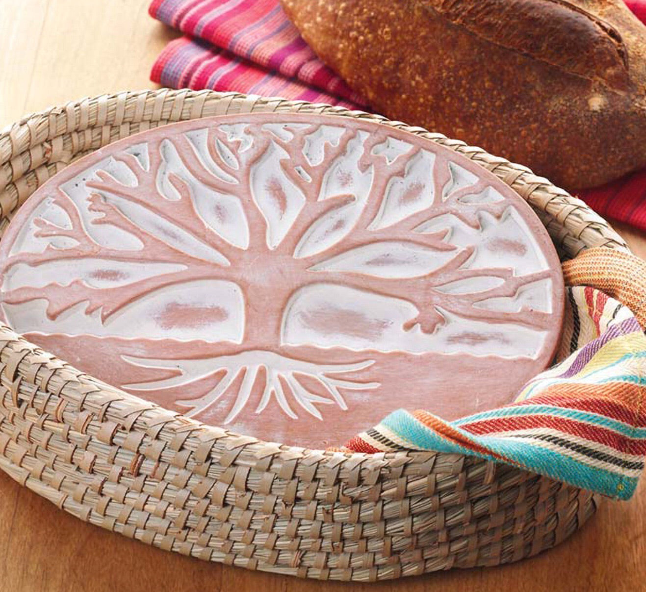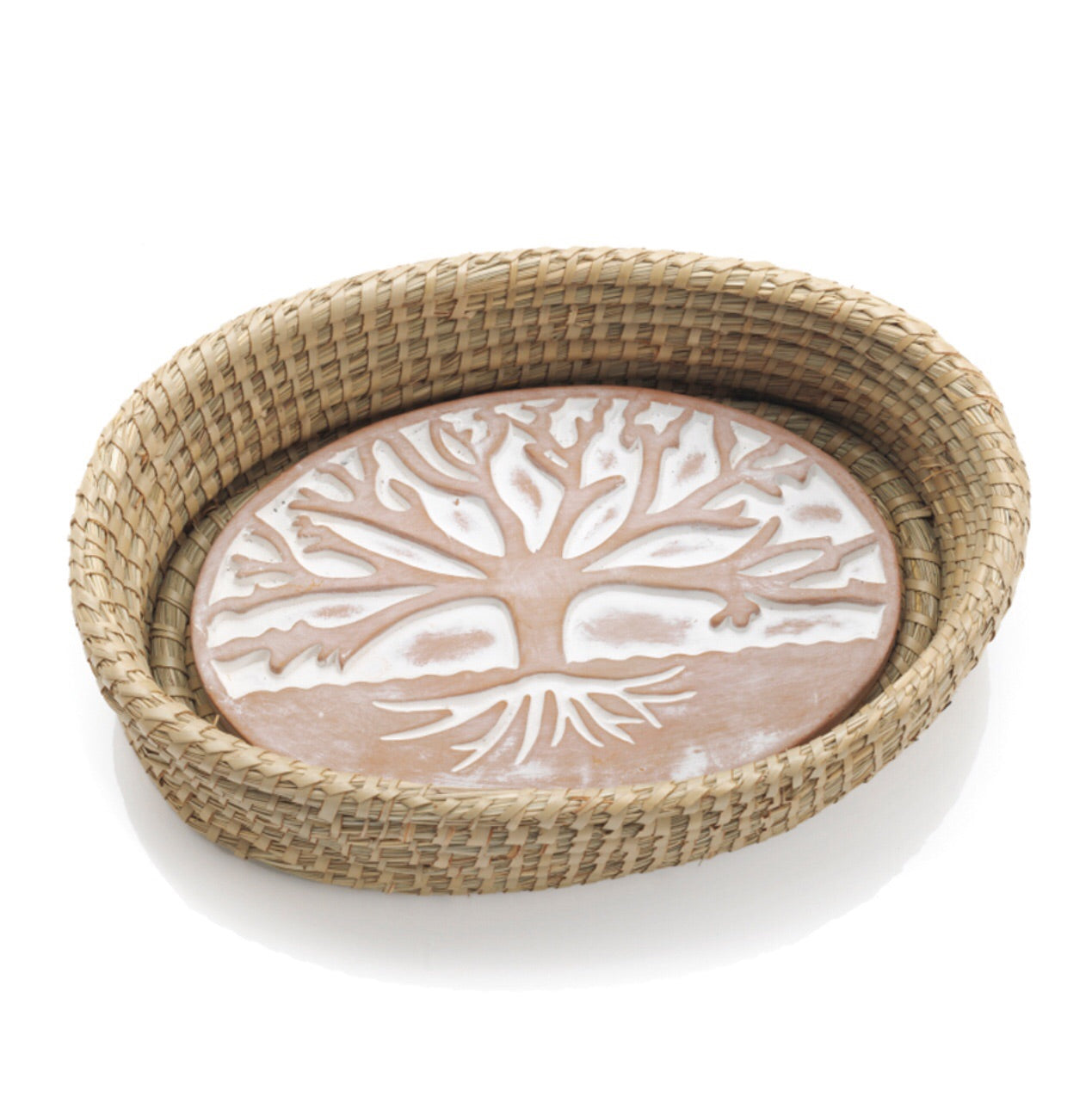 Whitewashed terra-cotta stone is incised with the Tree of Life and sits within a handwoven Kaisa grass basket. Warmer is oven safe. One of our most popular gift items! Each measures approximately 3"h x 12"w x 9"d.