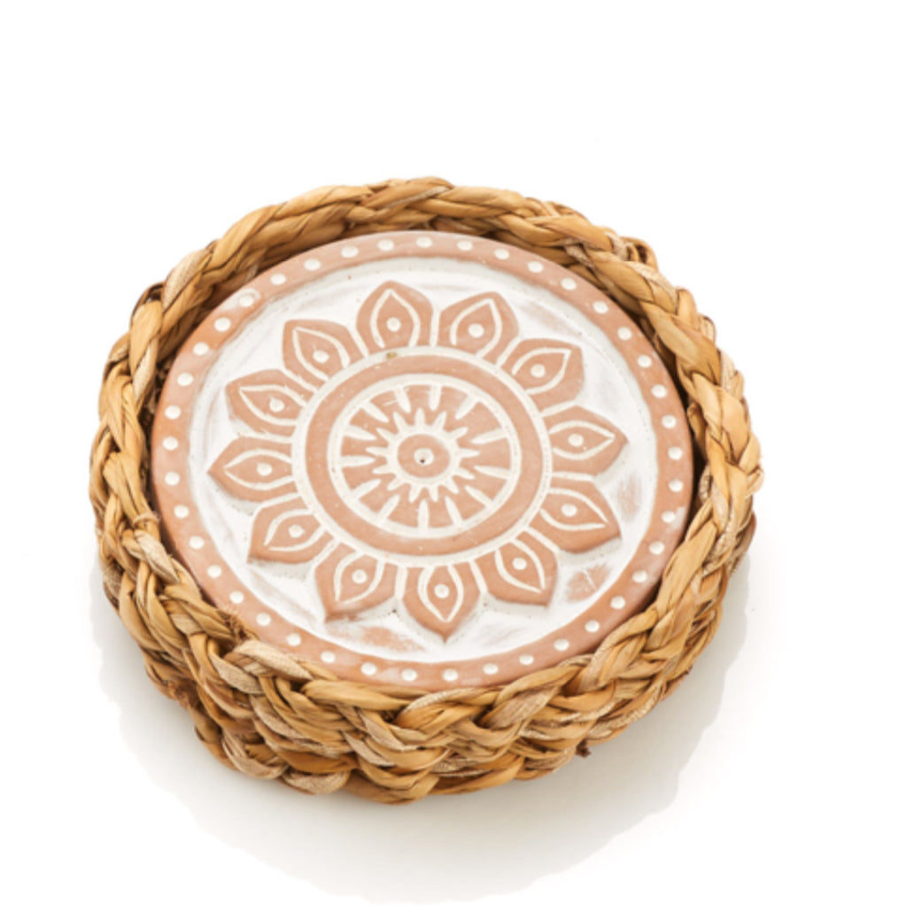 A smaller rendition of our bestselling breadwarmer! This coaster is is a beautiful companion for your favorite mug! When warmed in an oven, it can also keep hot tea, coffee, and cocoa warm. Coaster comes in a mini basket. Features small mandala design. Oven safe. Dimensions: 4 3/4"dia.