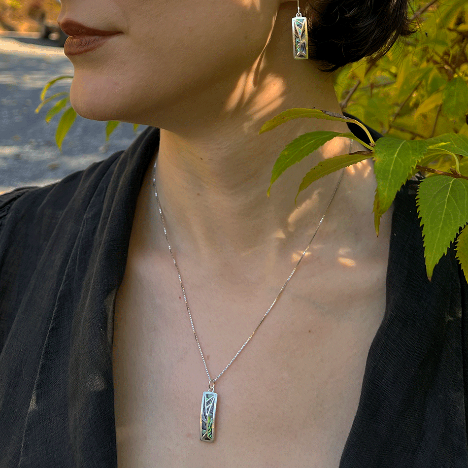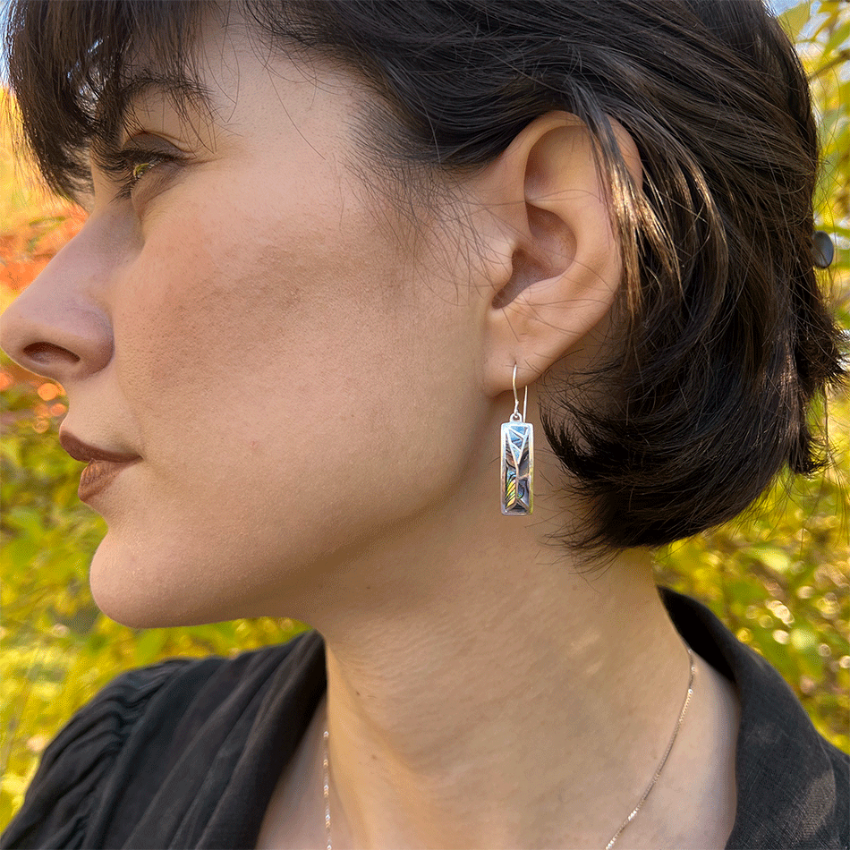 These exquisite earrings feature abalone shell encased in sterling silver, creating a unique mosaic-like design. Earrings measure approximately 7/8" in long (not including ear wire) by 1/4" wide. .925 Sterling silver;...