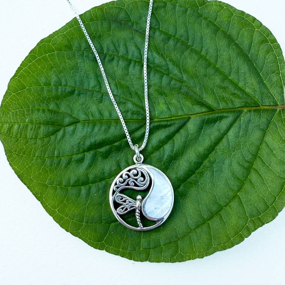 Women's Peace Collection - Mother-of-Pearl Dragonfly Circle Necklace - Sterling Silver, Indonesia